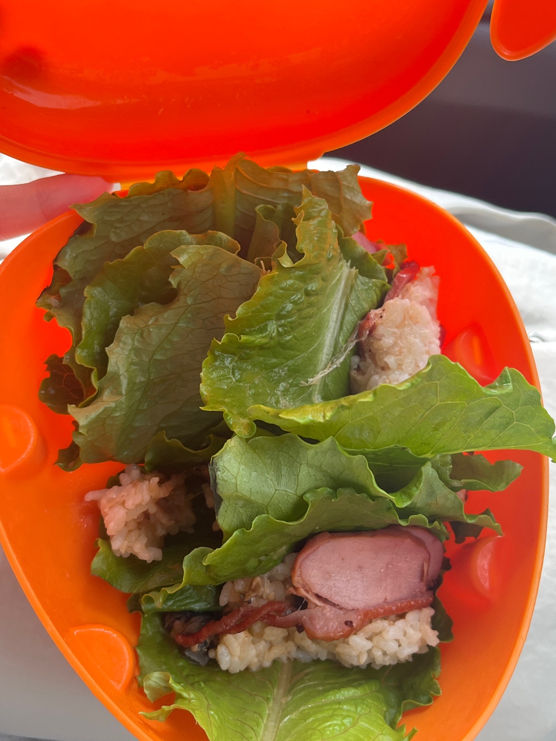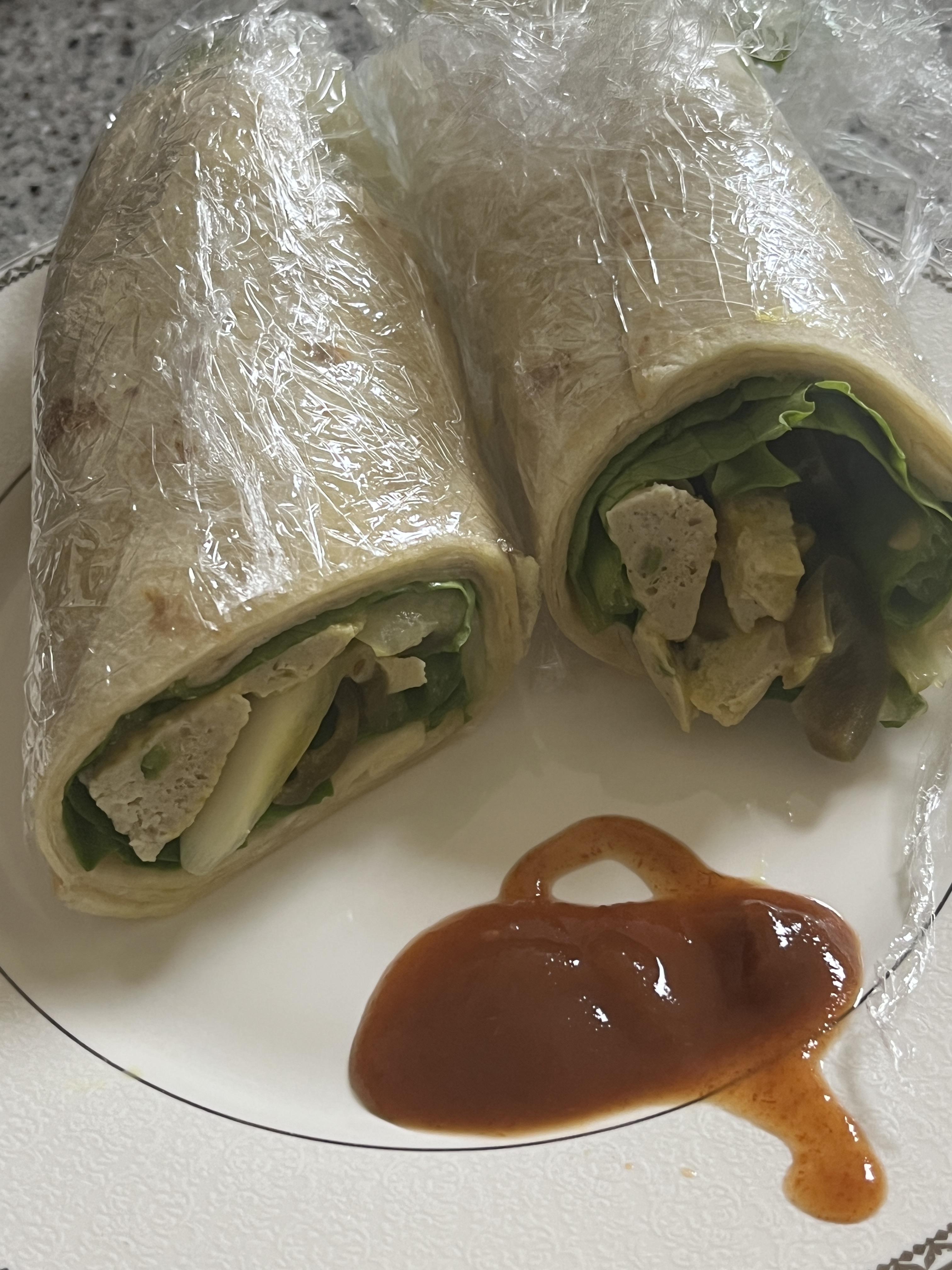 안에 닭가슴살, 상추, 치즈, 할라피뇨, 머스타드 뿌렸고